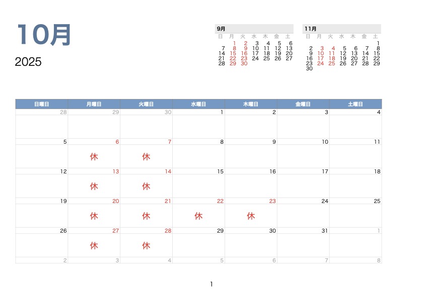 10月のお休みは以下の通りです。